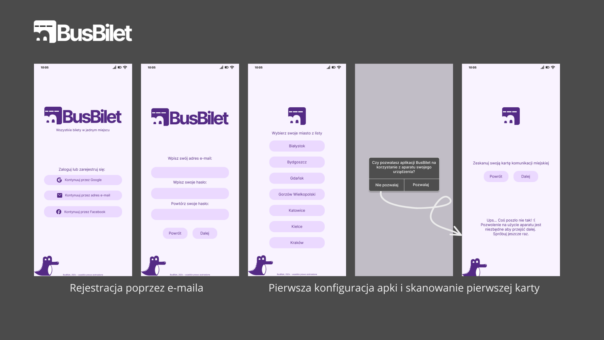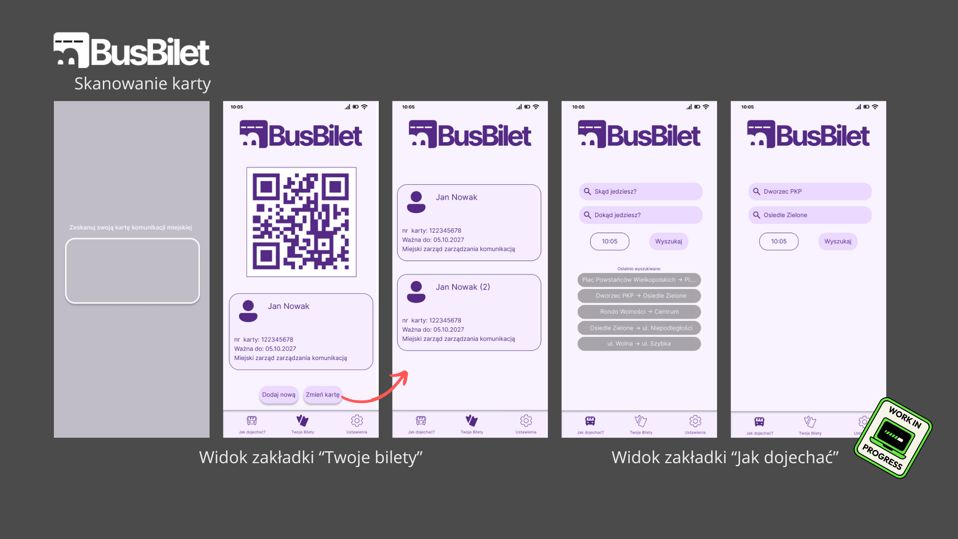Aplikacja BusBilet to autorski pomysł aplikacji której celem jest zastąpienie biletu okresowego w formie fizycznej, a dodatkowo dzięki niej będzie można w prosty i szybki sposób sprawdzić rozkład jazdy wybranych linii. W założeniu aplikacja ma mieć możliwość działać na terenie największych miast w Polsce. Bilet okresowy bądź kartę miejską skanuje się poprzez aplikację i już można się cieszyć jej użytkowaniem w BusBilet. Poniżej przedstawiono interfejs aplikacji (jest to projekt jeszcze w trakcie pracy, nie został on w pełni ukończony - wymaga "szlifów"